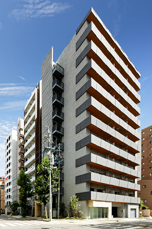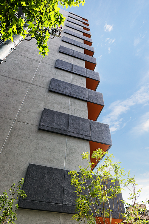周辺に建ち並ぶタイル貼りの共同住宅とは異なり、特殊塗装による外観を採用しました。視覚的な特徴となるバルコニーの積層と西面の凹凸のある仕上げが、時間とともに表情を変える都市の風景を創出することを目指しました。