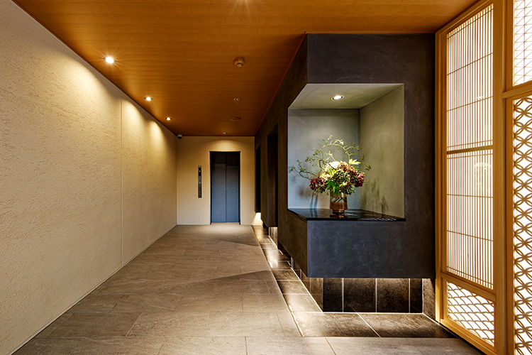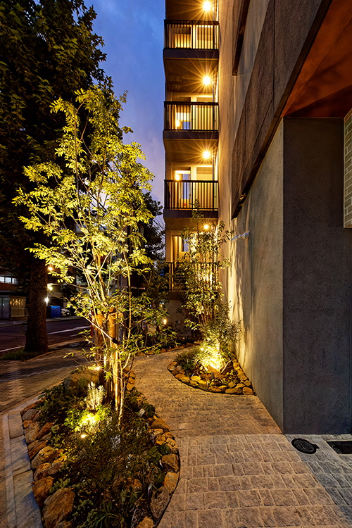 また、オーナー様がお花の先生であるため、エントランスには季節ごとにオーナー様が活けられる花を飾れるニッチを設け、見通しの良い交差点には植栽を配置しました。これにより、都市の住宅街に季節を感じられる花と暮らしが調和する豊かな住環境を実現する建物となりました。