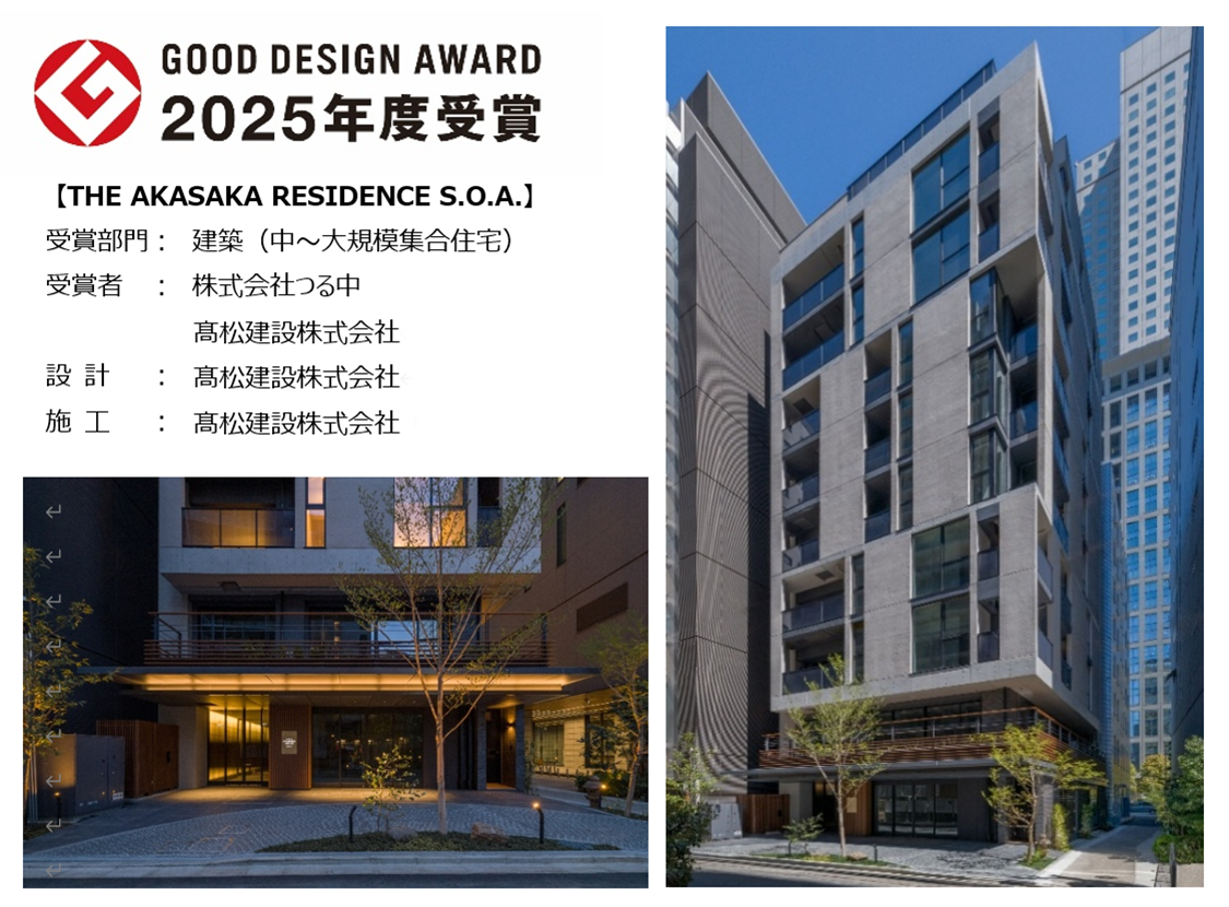 松建設株式会社(本社:大阪府大阪市、代表取締役社長:松孝年、以下当社)が設計・施工を手掛けた賃貸マンション「THE AKASAKA RESIDENCE S.O.A.」が、このたび2025年度グッドデザイン賞(主催:公益財団法人日本デザイン振興会)を受賞しました。本件は赤坂で長年老舗料亭を営まれてきた株式会社つる中と当社の共同受賞となります。