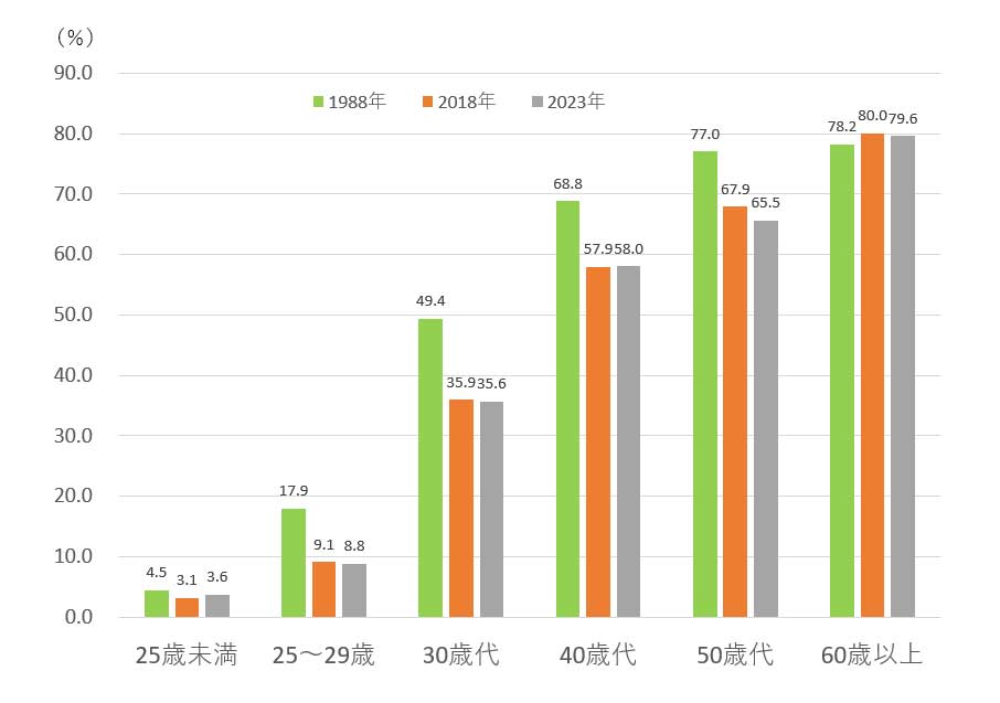 ‚±‚ê‚ðŒ©‚é‚ÆuŽ‚¿‰Æv‚ÉZ‚Þ‚±‚Æ‚ªˆê”ʉ»‚µ‚Ä‚¢‚½1988”Niƒoƒuƒ‹Šúj‚Æ‚»‚Ì30”NŒã‚Ì2018”N‚ð”äŠr‚·‚ê‚ÎA“Á‚É30‘ãE40‘ãE50‘ã‚ő傫‚’ቺ‚µ‚Ä‚¢‚Ü‚·B‚»‚µ‚ÄÅV‚Ì2023”N‚̃f[ƒ^‚ðŒ©‚Ä‚àAŽ‚¿‰Æ”ä—¦‚ÍŒ¸‚ª‚‚¢‚Ä‚¢‚Ü‚·B