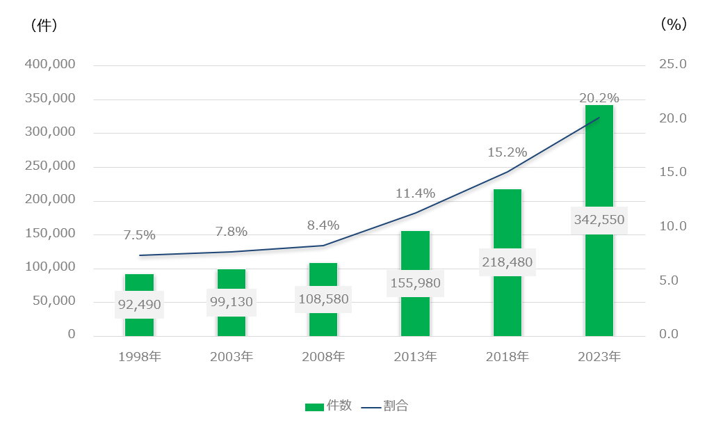 グラフを見ると、5年ごとに行われる「法人土地統計調査」で2008年以降急激に増えている状況が分かります。もちろん、この中には賃貸住宅経営のみを行う会社も含まれていると思いますが、2008年には全体の8.4%が2023年には20.2%となり、件数は10.8万戸が34.2万戸となり約3倍となっています。つまり5社に1社の割合で、企業が賃貸用住宅を保有している現状が分かります。