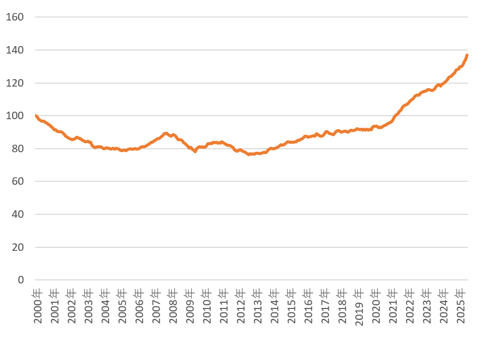 Žw”‚Í2000”N1ŒŽ‚ð100‚Æ‚µ‚Ä‚¢‚Ü‚·B2013”N1ŒŽ‚ÌŽw•W‚Í77.07A2025”N1ŒŽ‚ÌŽw•W‚Í128.45‚ÅA’PƒŒvŽZ‚·‚邯–ñ1.67”{‚ƂȂè‚Ü‚·B