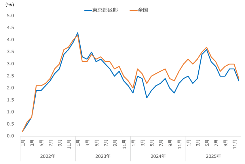 こちらのグラフは、総務省が公表している2つの消費者物価指数(全国と東京都区部)のうち、生鮮食品を除いた「コアCPI(コア指数)」の2022年からの推移を示しています。 これによると、物価上昇は2022年4月頃から始まり、その後も収まることなく継続しています。