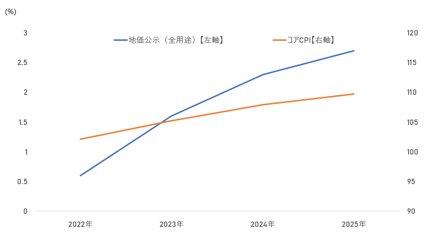 こちらのグラフは、消費者物価指数(全国コアCPI)の各年平均(2025年は10月まで)と地価公示における全国全用途の変動率を重ねたものです。これを見ると、物価上昇と地価上昇のグラフが概ね連動していることが分かります。
