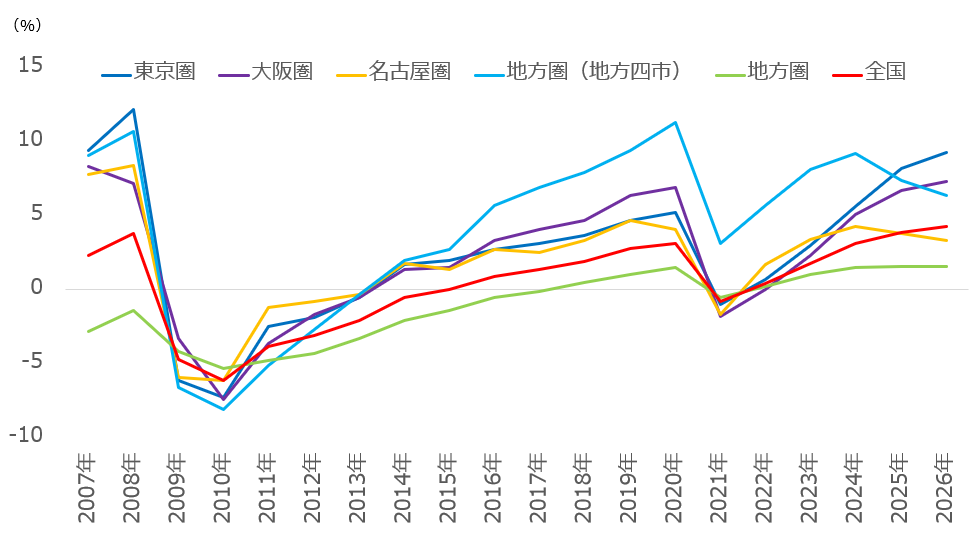 一方で、名古屋圏・地方圏全体・地方四市では上昇幅は縮小しました。
